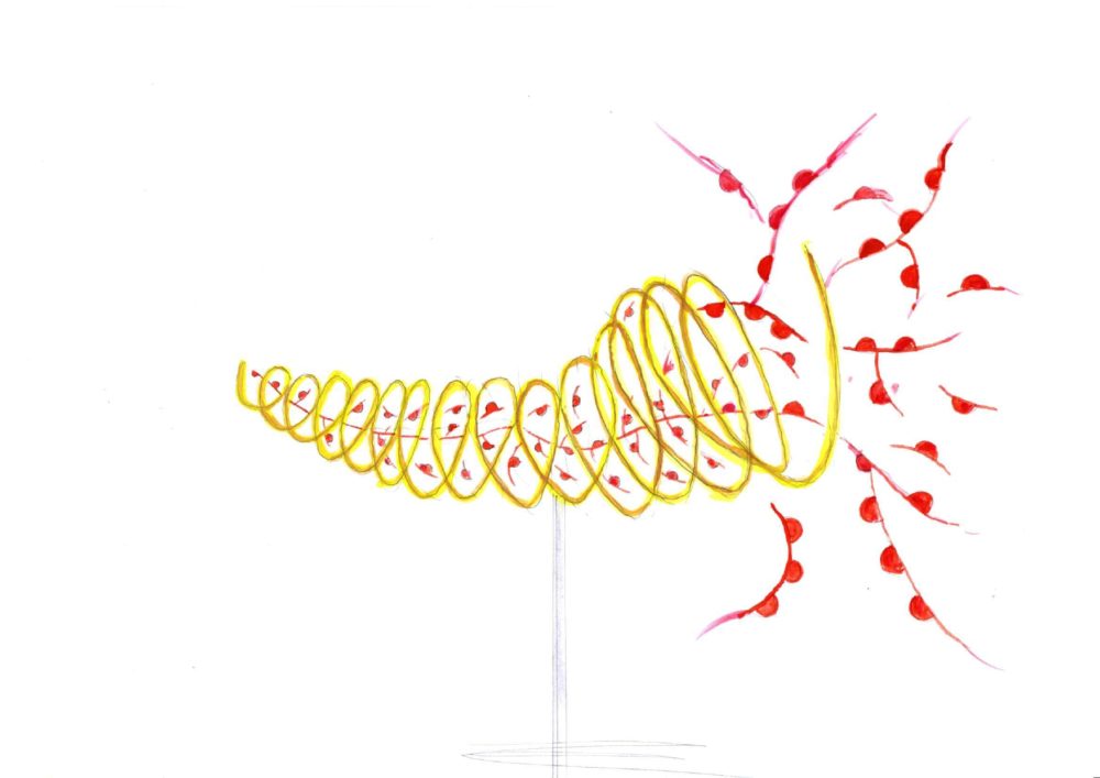 Cornucopia consists of a golden, spiral-shaped horn that rises several meters above the ground, mounted on a base in the dramatic landscape of Kvarntorpshögen, in the sculpture park Konst på hög, outside the city of Kumla.